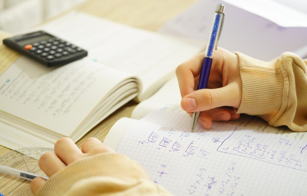 the boy is solving math problems in his notebook. Repeating before the matura exam. Secondary school exit exam in various European countries.